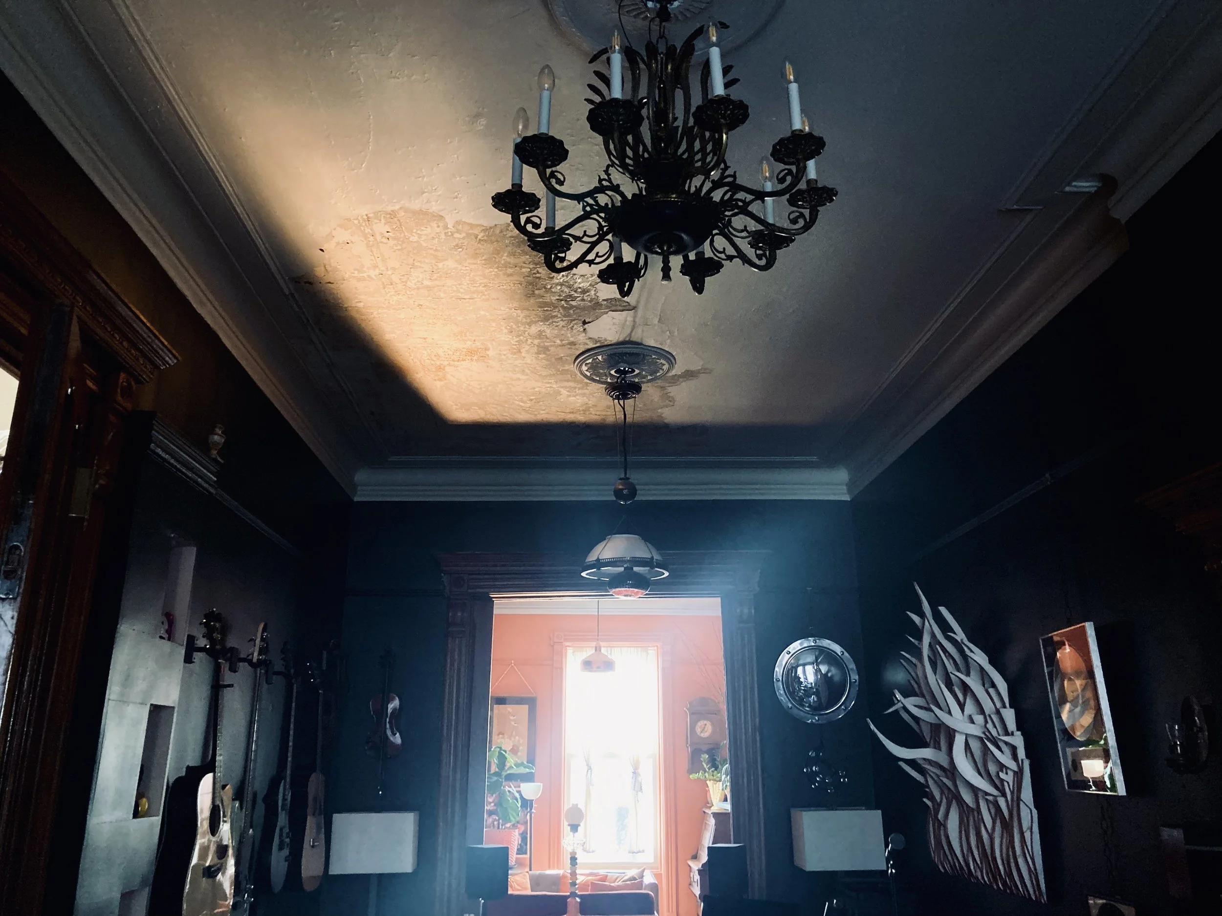 Anyway, this is how we ended up with the layout for the parlor level, which remains virtually the same as the day it was built. There is the usual entrance hall with the stairs going up and down, divided from the rest of the floor by a supporting wall that runs front-to-back almost down the spine of the house, and also not one but two living spaces separated by pocket doors. These two living spaces would have been the most public-facing spaces in the house, likely used for entertaining. And it’s evident in the amount of money and labor that went into them: the ceilings are 12 feet tall with large cove moldings, and they were evidently painted with a motif (see our earlier post for more on that); the doors have thick veneers of figured maple; the twin fireplaces - only one of which survives - were adorned with spoon carvings and spindles.