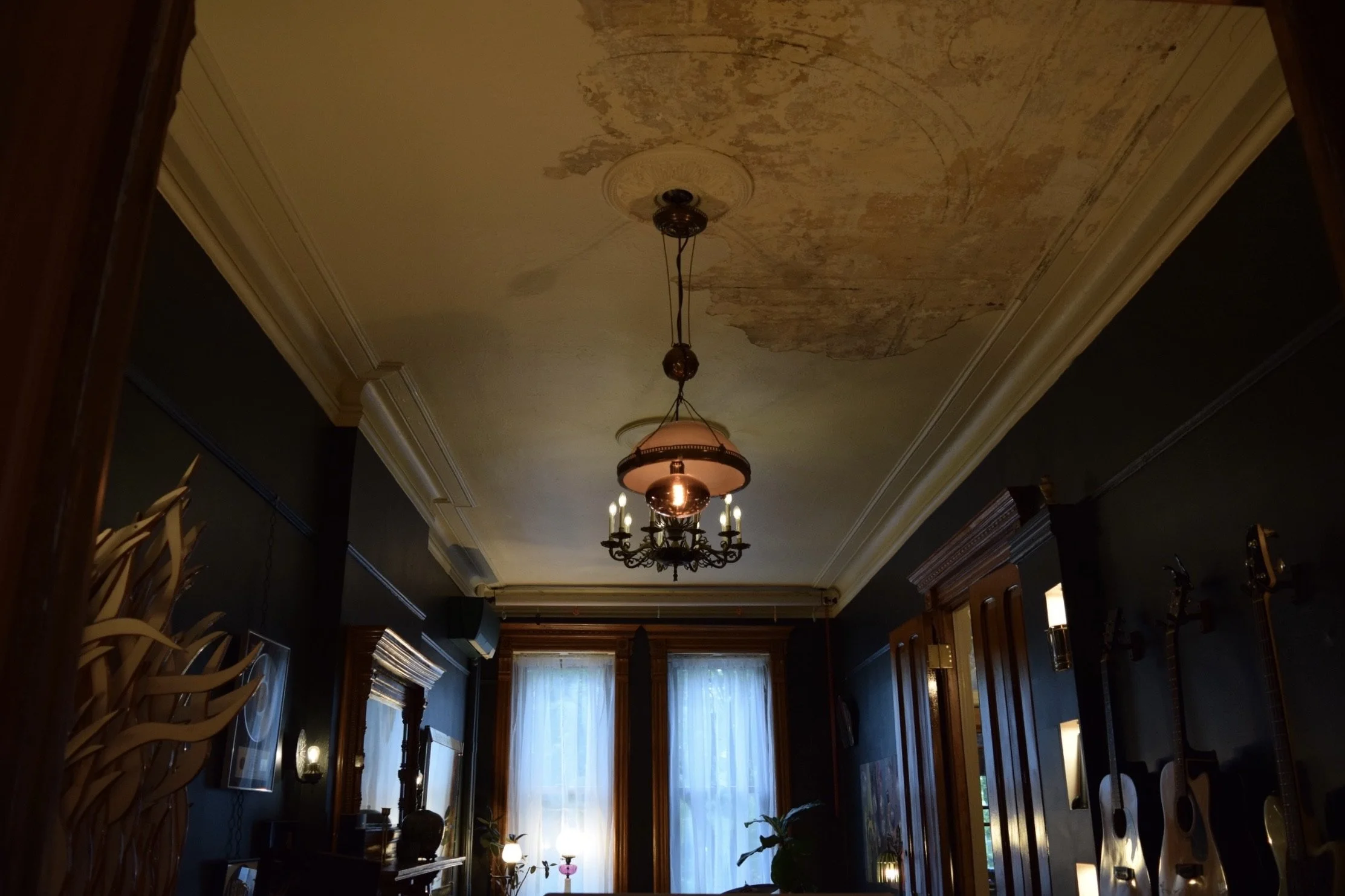 The ceilings are 12 feet tall with large cove moldings, and they were evidently painted with a motif.